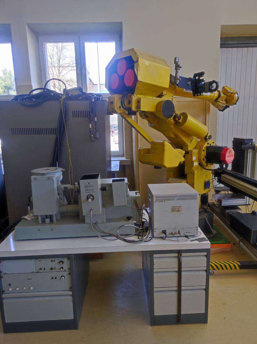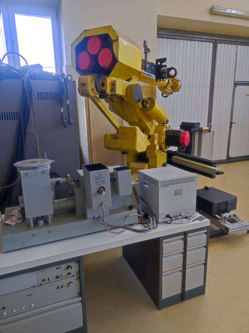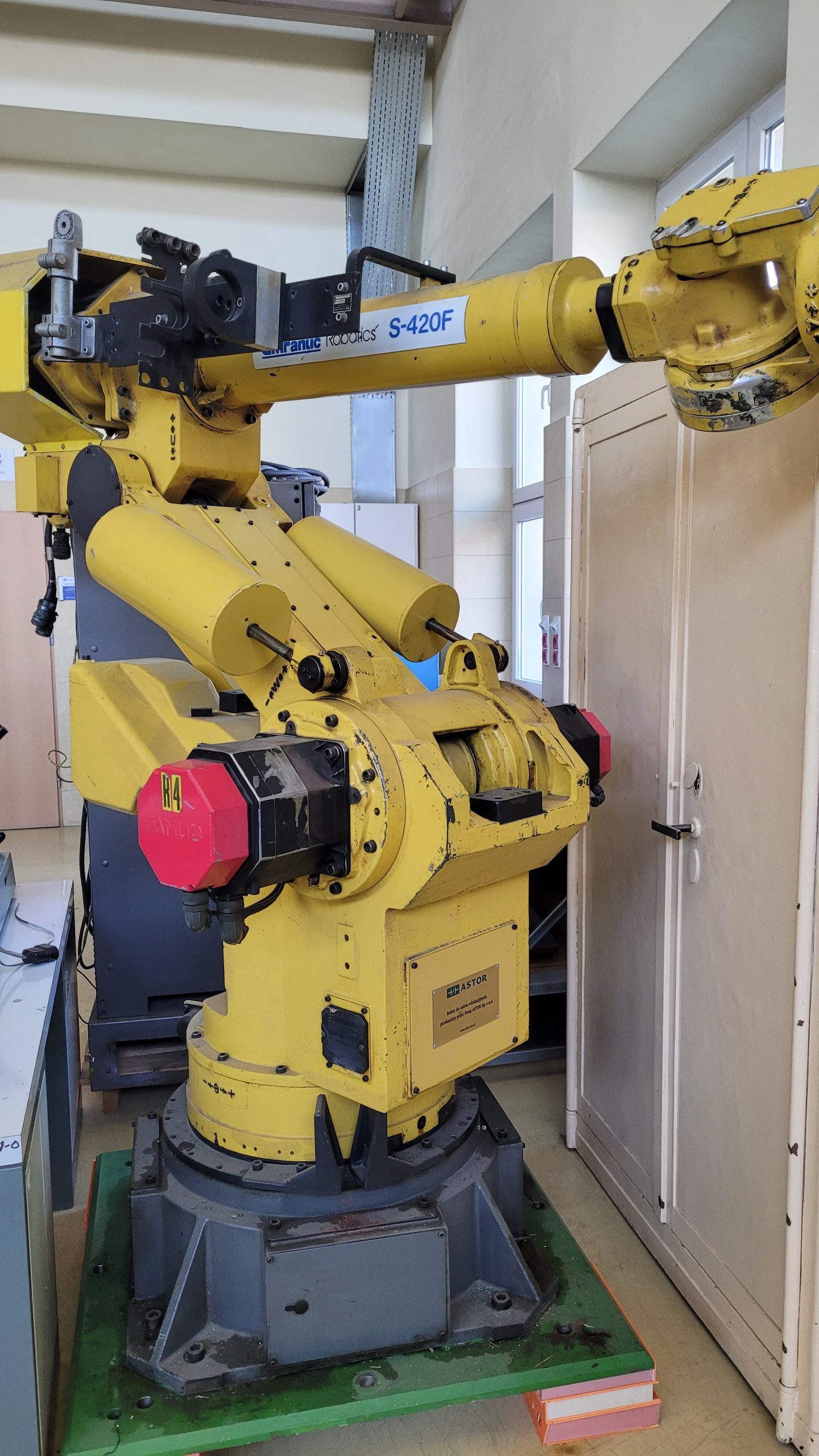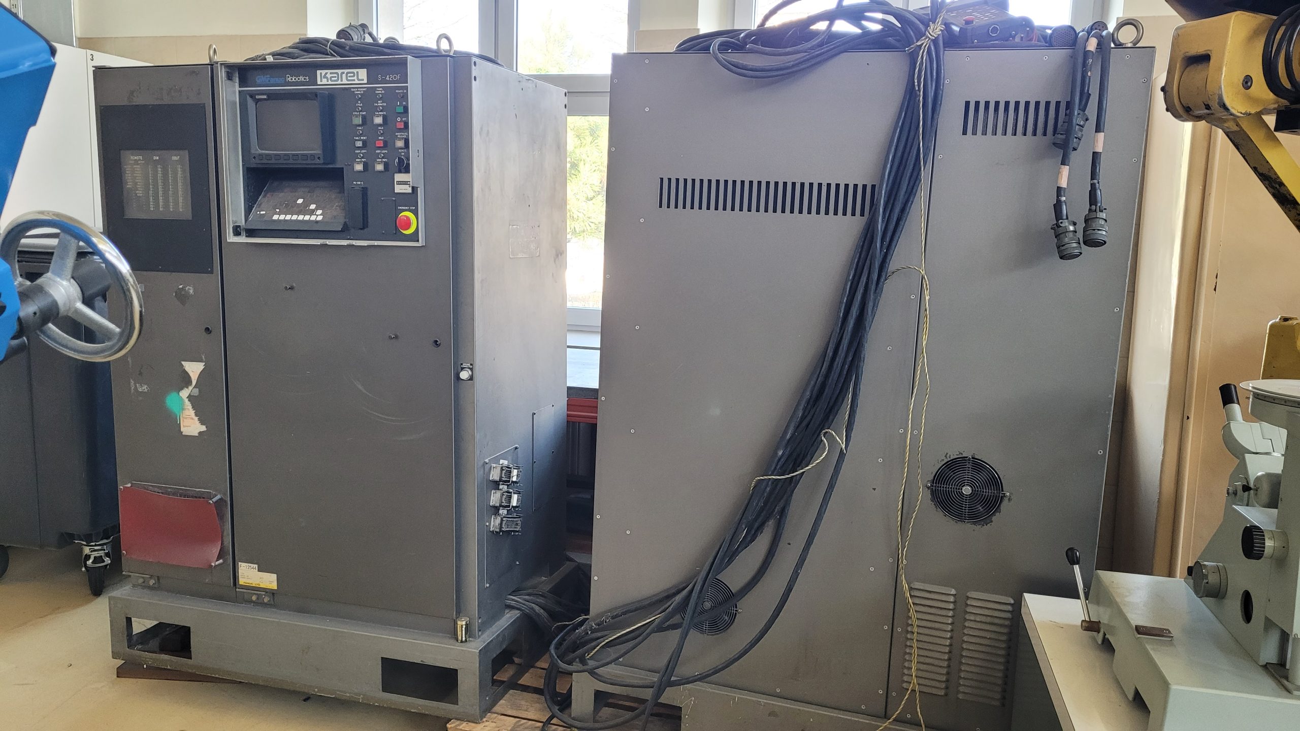 Robot przemysłowy FANUC ROBOTICS model 420F w stanie technicznym dobrym, sprawny, używany był tylko do zajęć dydaktycznych, rok produkcji 1991, szafa sterująca, przewody przyłączeniowe. Szafa sterownicza – zapasowa – niekompletna.